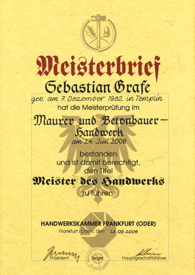 Im Jahr 2006 legte Sebastian Grafe erfolgreich seine Meisterprüfung ab und übernahm in den folgenden Jahren zunehmend Verantwortung für Bauvorhaben, Mitarbeiterführung und Unternehmensentwicklung.